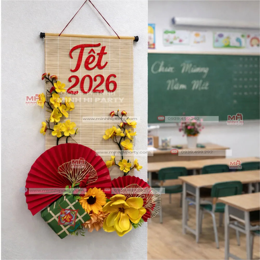 Background Trang Trí Tết 2026 Với Mành Tre – Quạt Xòe – Hoa Mai Cực Đẹp