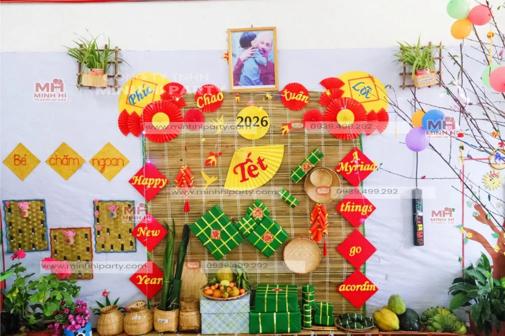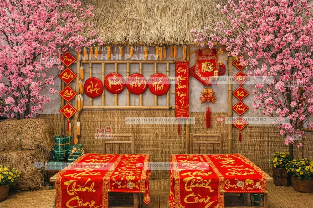 Backdrop Tết mini kích thước khoảng 2m – 3m, bố trí gọn gàng