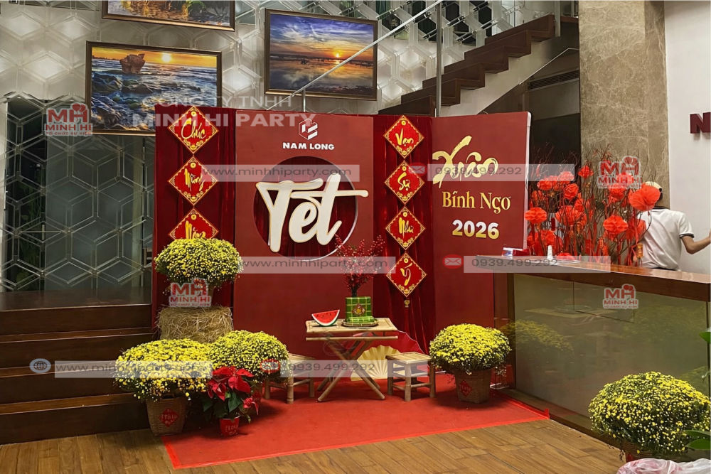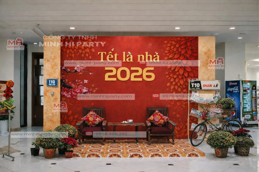 | Backdrop Tết mini | Backdrop khung gọn, in PP/Hiflex, trang trí hoa – phụ kiện Tết cơ bản | Văn phòng nhỏ, sảnh mini, lớp học, nhà phố | 1 – 2 giờ | Từ 3.500.000đ |