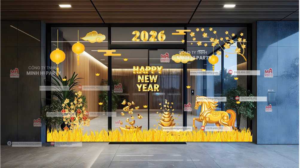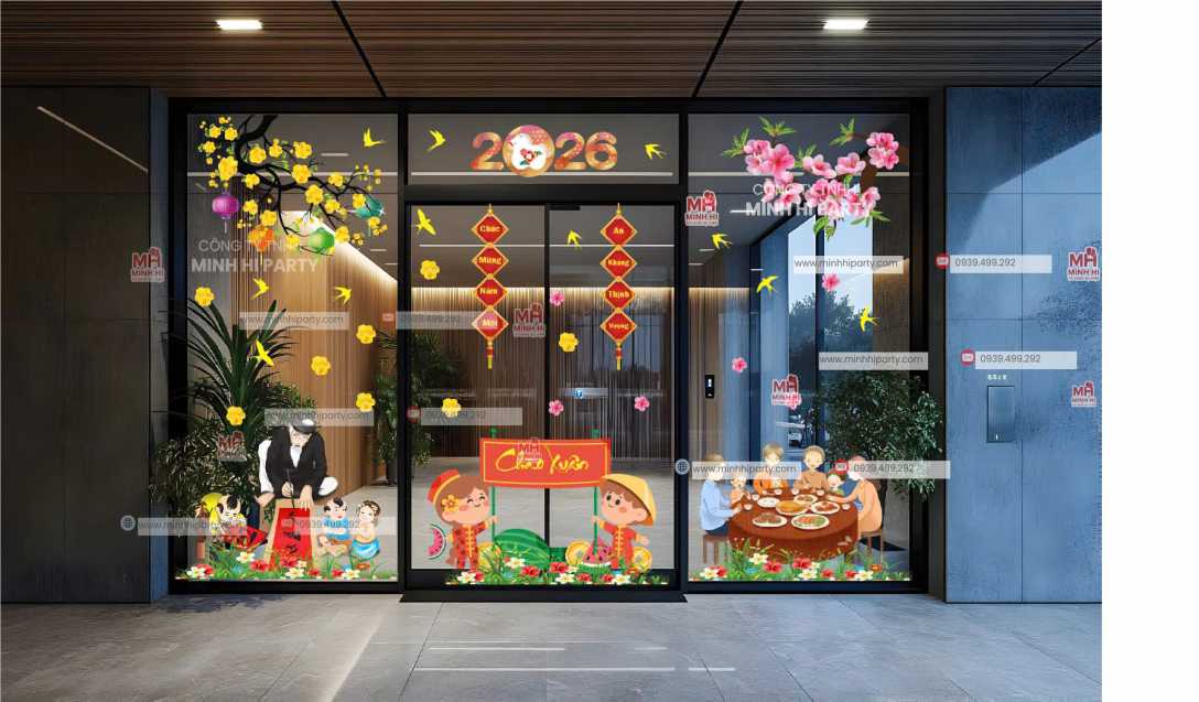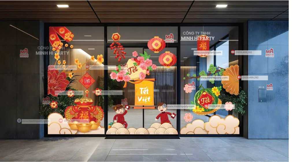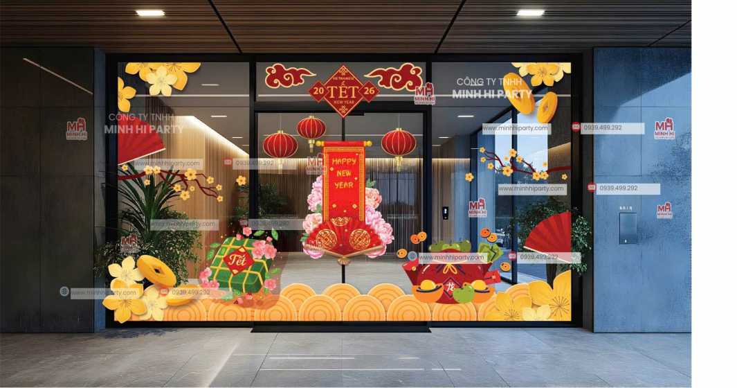 30 Mẫu Decal Tết 2026 Phù Hợp Mọi Không Gian là giải pháp trang trí Tết hiện đại, linh hoạt và tiết kiệm, được Minh Hi Party thiết kế và thi công trọn gói cho doanh nghiệp, văn phòng và khu vực công cộng.