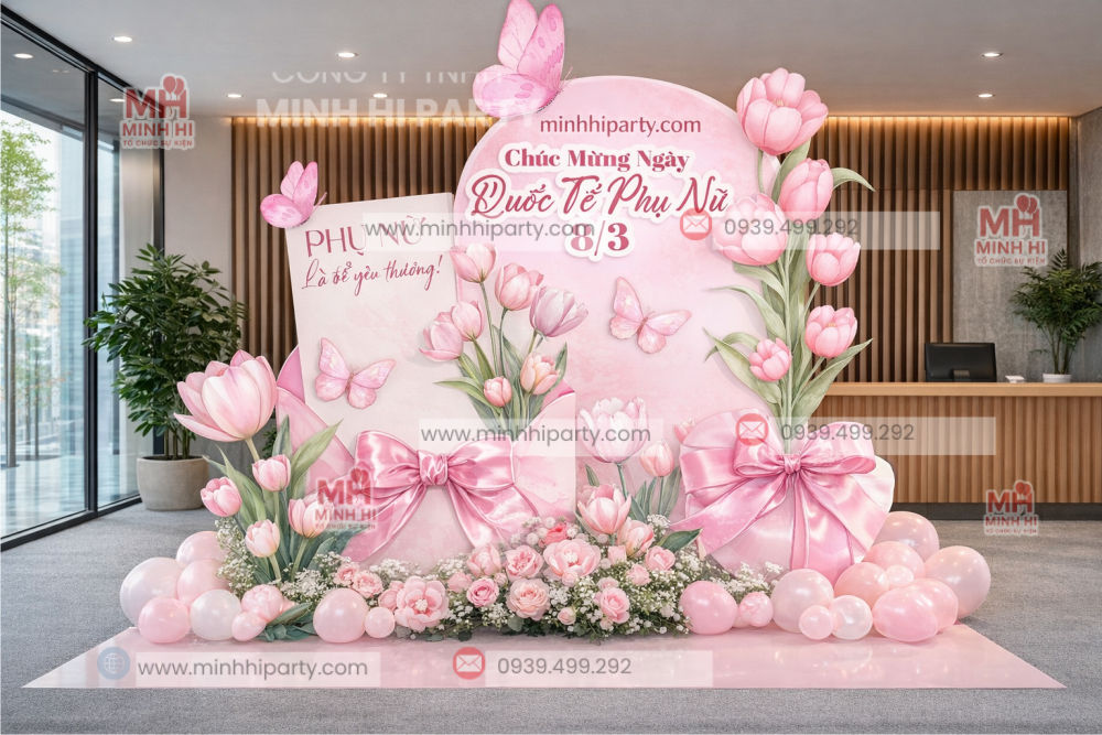 Dịch vụ trang trí 8/3 tại HCM trọn gói giúp doanh nghiệp và cá nhân tổ chức ngày Quốc tế Phụ nữ chuyên nghiệp, ấn tượng và tiết kiệm thời gian. Minh Hi Party cung cấp giải pháp thiết kế – thi công – tháo dỡ trọn gói, đảm bảo đúng concept, đúng tiến độ và tối ưu ngân sách.