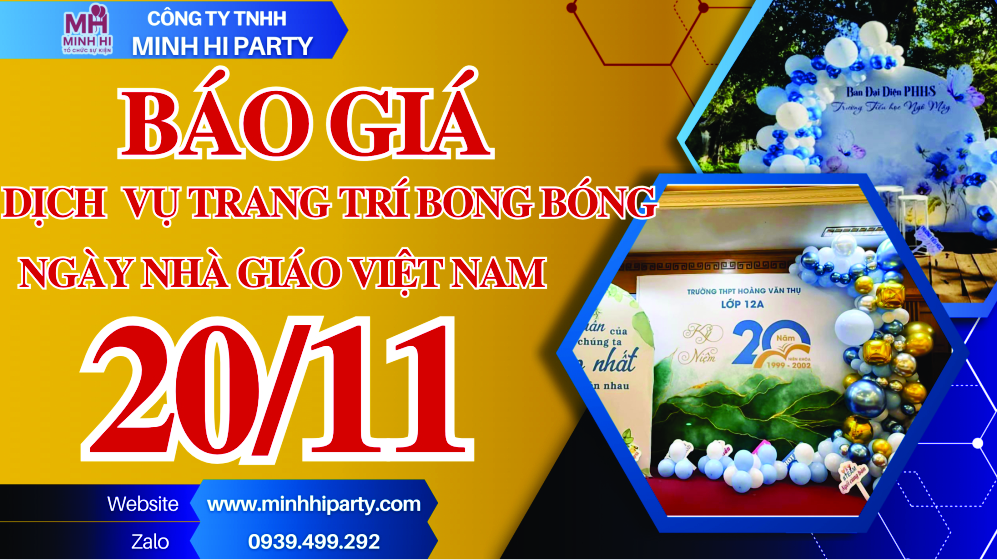 Minh Hi Party là đơn vị trang trí sự kiện chuyên nghiệp, đặc biệt trong các hạng mục trang trí bong bóng 20/11, photobooth 20/11, trang trí sân khấu, hoa bong bóng nghệ thuật tại TP.HCM, Bình Dương, Đồng Nai và khu vực lân cận.