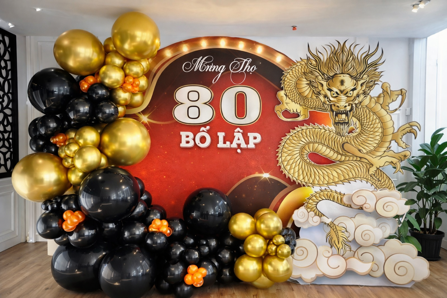 Không gian trang trí thường được thiết kế với backdrop nổi bật, in rõ nội dung “Mừng Thọ 80 Tuổi” cùng tên người được chúc thọ. Các chi tiết trang trí như hoa mai, hoa đào, lồng đèn hay quạt giấy được sắp xếp hài hòa nhằm tạo nên tổng thể vừa trang nghiêm vừa ấm cúng. Sự kết hợp này không chỉ phù hợp với không gian gia đình mà còn dễ dàng thi công, đảm bảo tiến độ và tính thẩm mỹ.